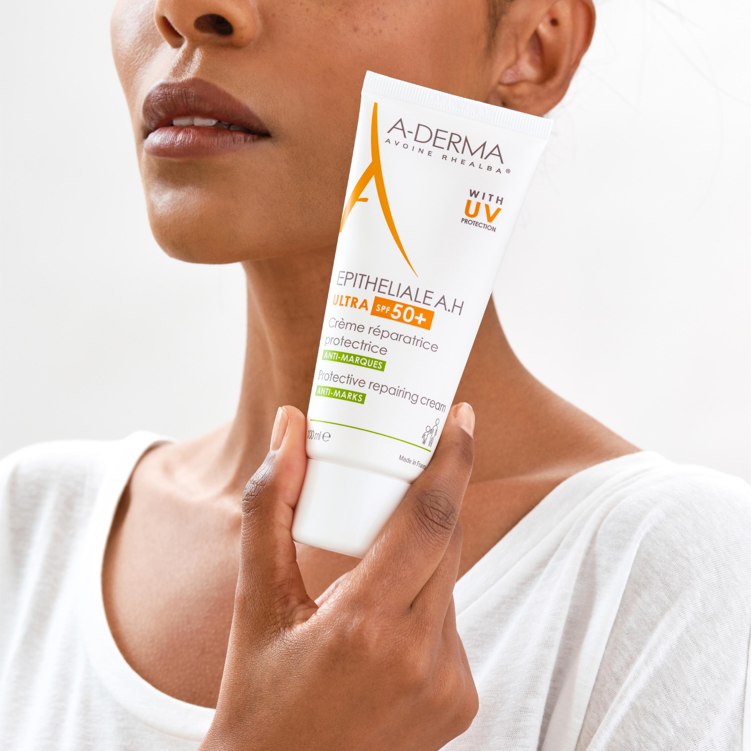 El producto EPITHELIALE A.H ULTRA SPF50+ está creado para reparar y proteger las pieles debilitadas que se exponen al sol, al mismo tiempo que reduce significativamente las marcas en tonos marrones y rojos.
